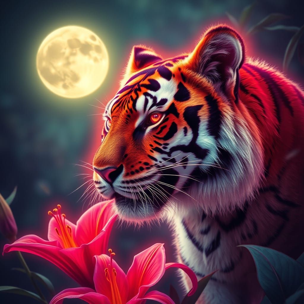 A hyperrealistic image of a tiger lily bathed in neon light under a full moon. The illustration features lush, glowing colors and intricate details.