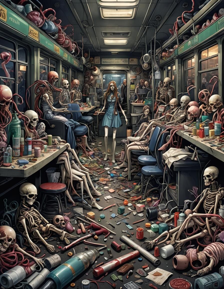 This image shows a city at night, with a bus and other elements suggesting societal decay. It is rendered as digital art with pastel colors, mixing horror and dreamlike elements.