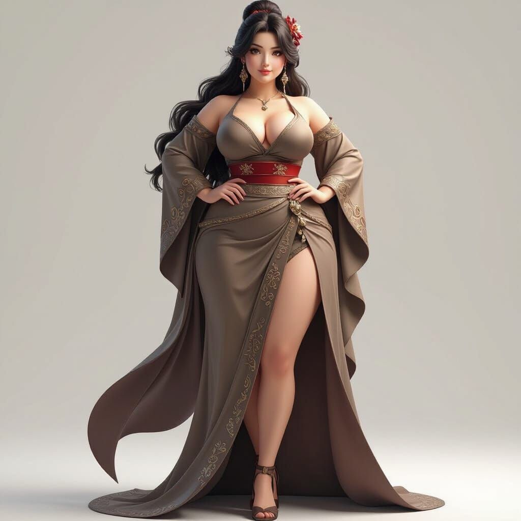 This image portrays a confident, curvy woman in an elegant outfit. The artwork blends anime and 3D art with highly detailed textures, reminiscent of concept art, rendered in 8k resolution.