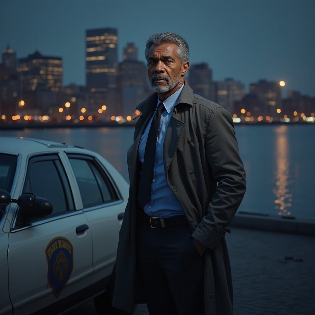 This image shows a detailed portrait of a mature African American man with a weathered face and distinctive receding hairline, set against a nighttime cityscape, with a police cruiser and Boston's harbor in the background, rendered in a photorealistic style.