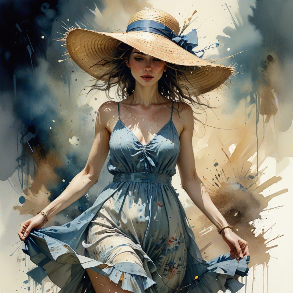 A watercolor painting of a woman in a sundress and large hat, full of breezy action. The artwork features rough paint strokes, textures, and dramatic lighting, rendered as fine art.