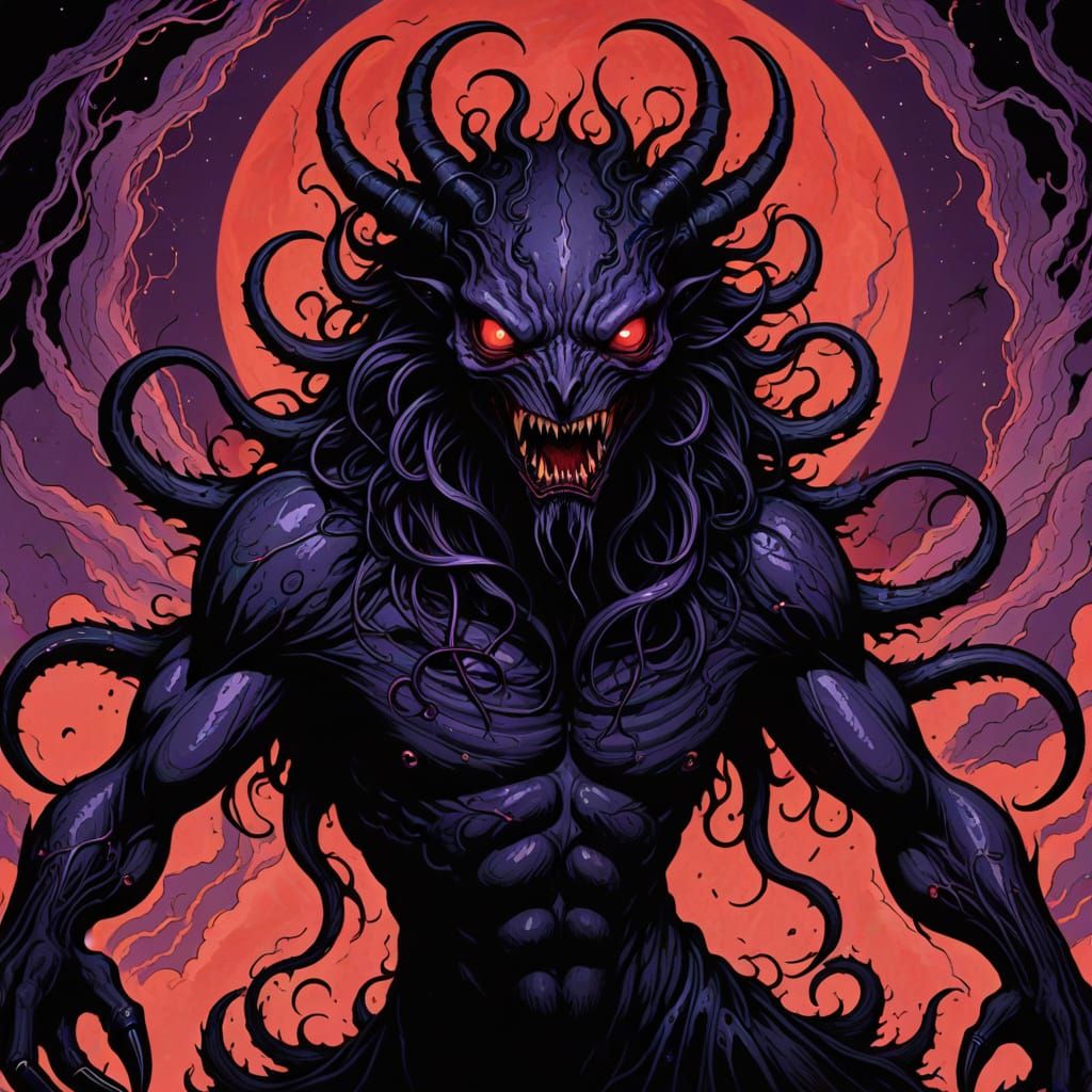 A striking picture of a Lovecraftian incubus creature with black claws and glowing red eyes. The creature is depicted with twisted shadowy tendrils and an ominous purple glow, in a dark fantasy art style.