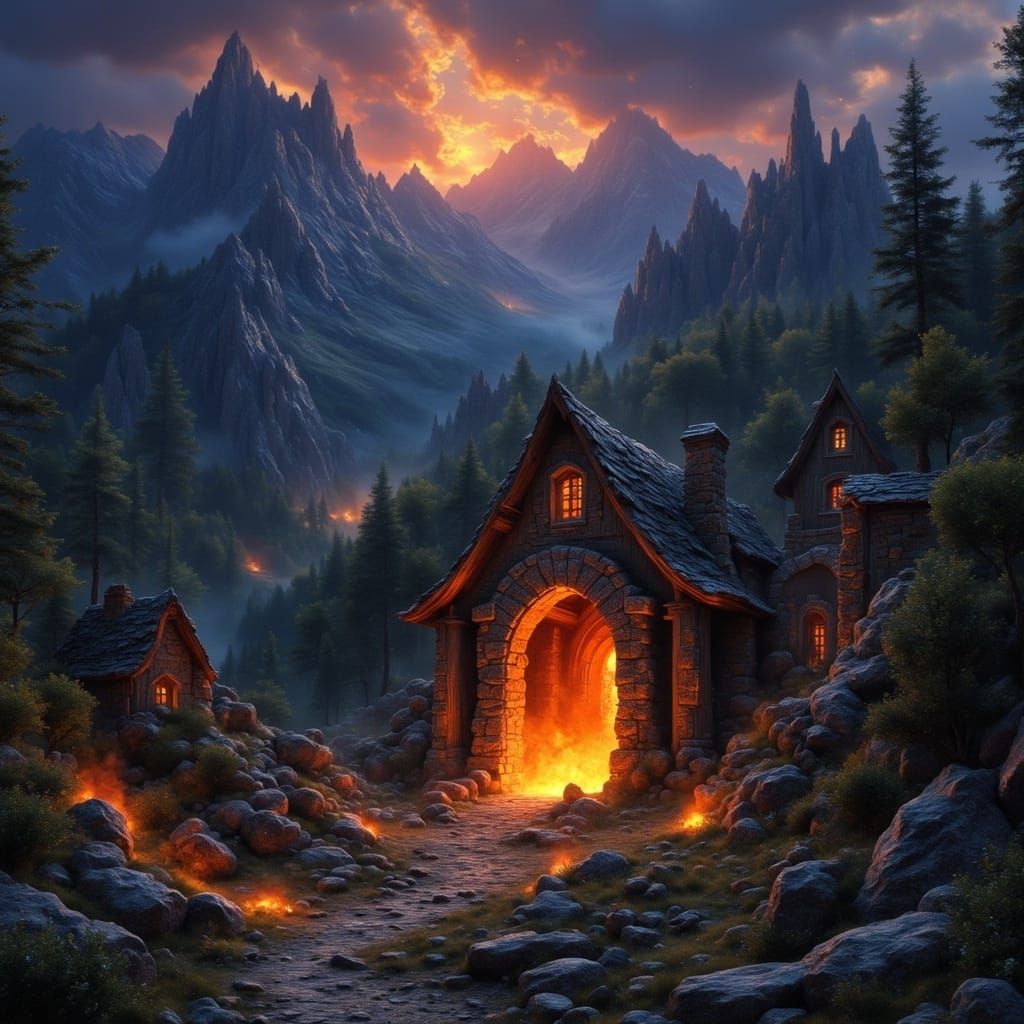 A breathtaking fantasy scene of an ancient forge nestled in mystical mountains. The image showcases a colossal entrance with intricate runes and magma veins, set against a rich dusk sky, as digital art.
