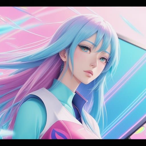 This image shows a person engrossed in watching anime on a screen. The artwork features a moe-inspired character design, pastel colors, and dynamic lighting, reminiscent of Japanese pop culture.