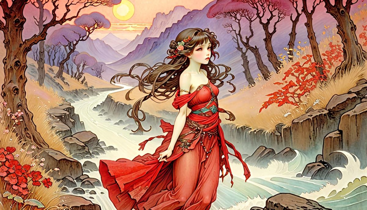 This image is a captivating watercolour depiction of serene, blood-soaked landscapes, evoking a sense of Pre-Raphaelite beauty and mystique.