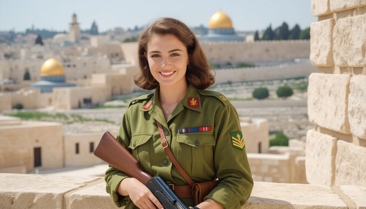 This image depicts a striking portrait of a Jewish female soldier standing in Jerusalem during the historic year of 1948.