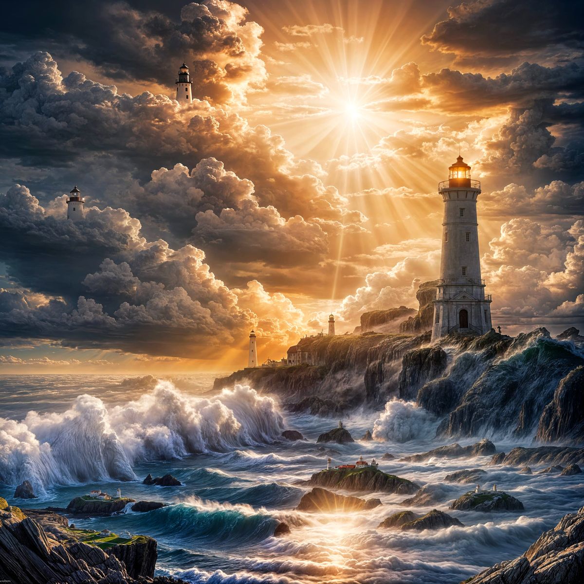 Generate unique lighthouse images with dramatic clouds and sunlight. It's free and easy to use!
