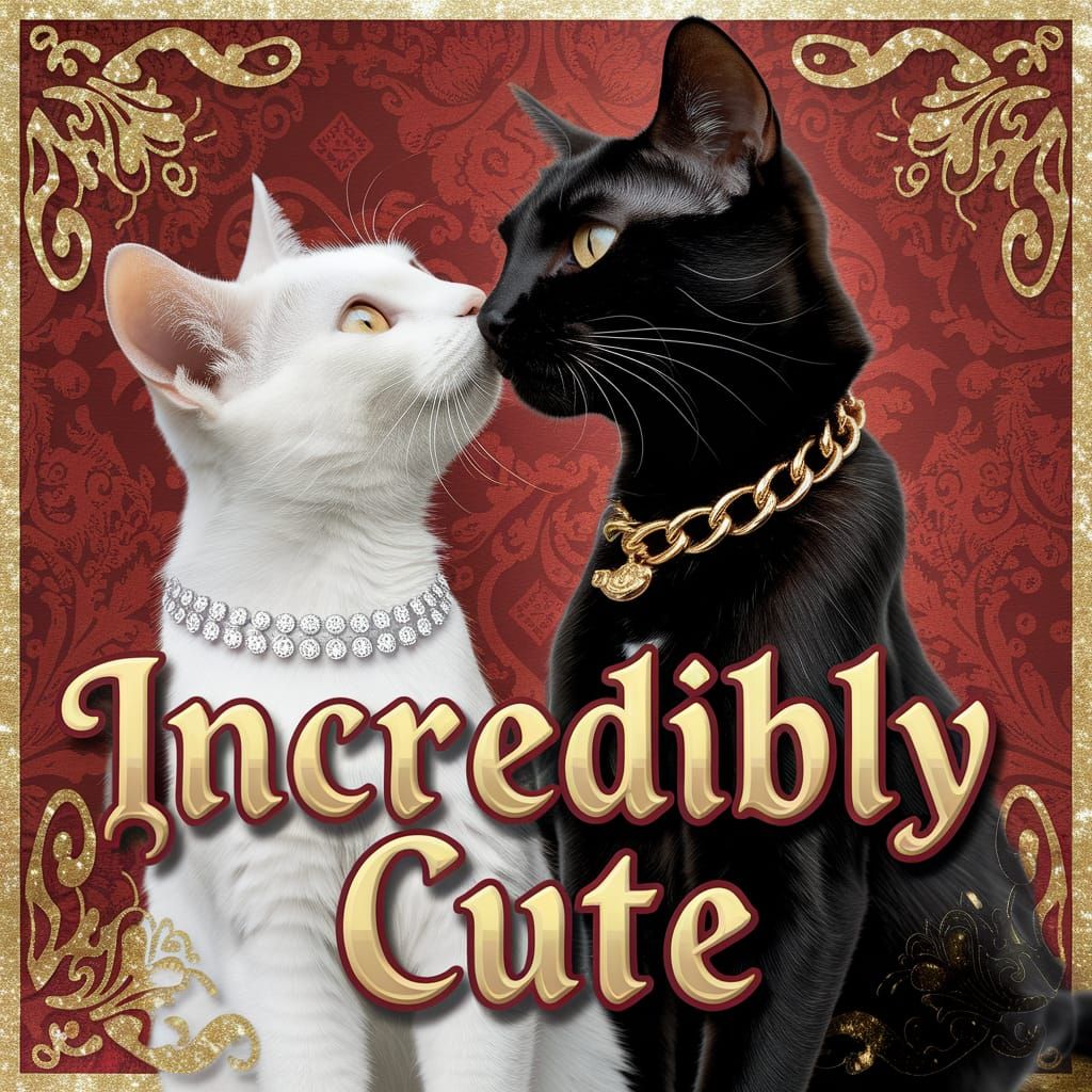 This image shows two cats, one white and one black, affectionately nuzzling each other. The white cat wears a diamond necklace, while the black cat sports a gold chain, set against a decorative red background.