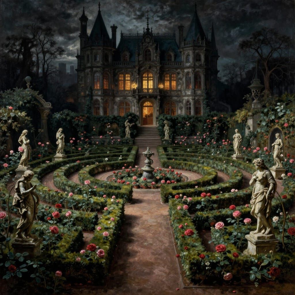 This image features a detailed baroque garden maze with ornate roses and statues leading to a gothic mansion. Rendered in a dramatic, dark oil painting style with chiaroscuro lighting, it evokes mystery and grandeur.