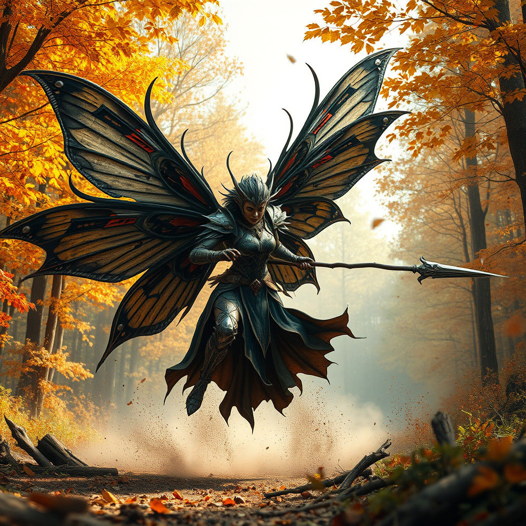 Explosive action image: A beautiful terrifying faerie queen in a chitinous bladed armor lands explosively and battle-ready with a long spear in-hand, her enormous symmetrical moth wings sending up a cloud of dust and debris. In a vibrant autumn forest.