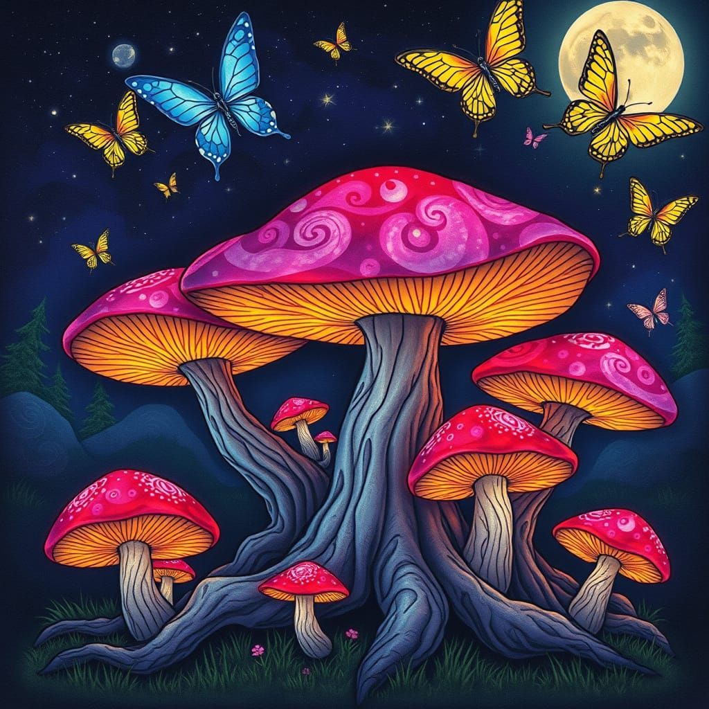 A vibrant psychedelic watercolor illustration depicting a cluster of bioluminescent mushrooms bathed in the ethereal glow of a night sky. The mushrooms feature intricately detailed caps with swirling patterns and vibrant accents of red, pink, purple, and blue, clustered around the base of ancient trees. ...