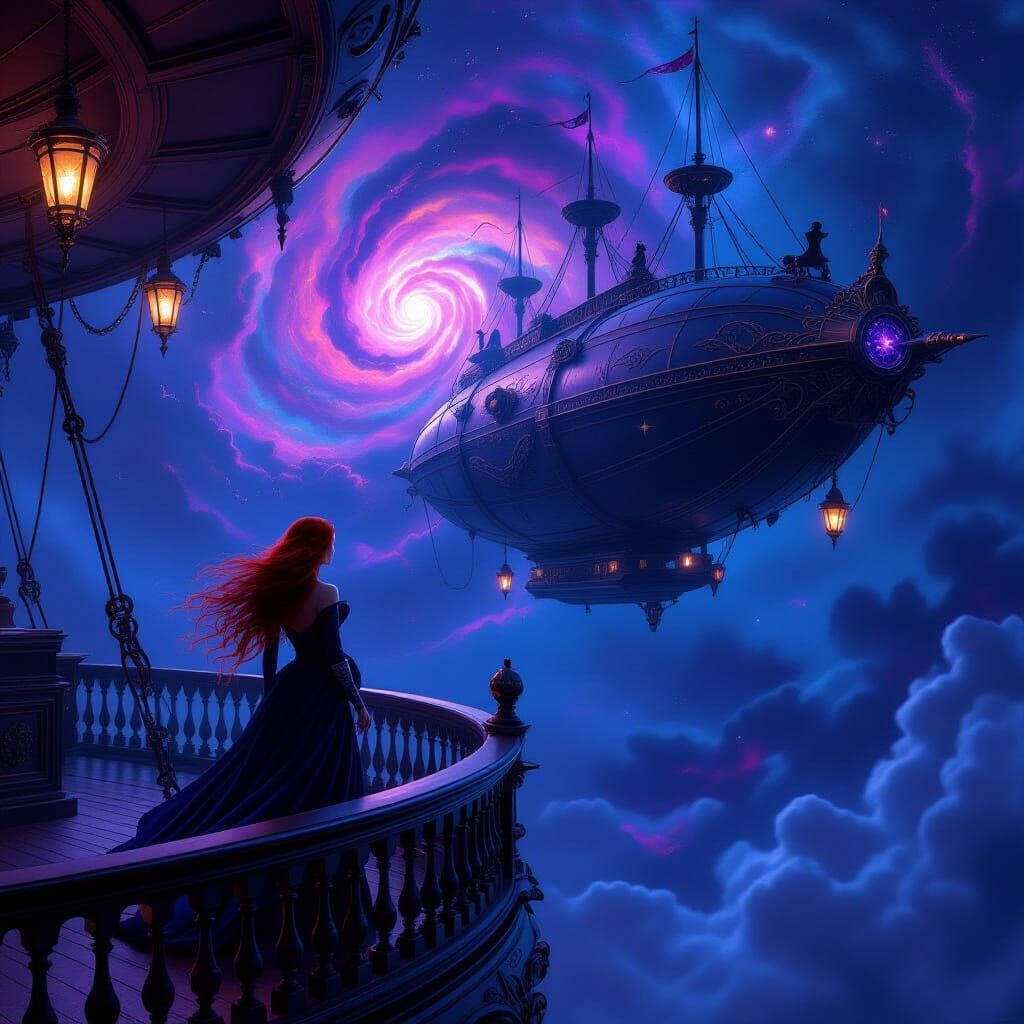 This hyper-realistic fantasy art depicts an elegant woman on an ornate airship deck, viewing a cosmic nebula. Features dark fantasy carvings, arcane crystal light, and dramatic cinematic lighting with deep shadows and highlights.