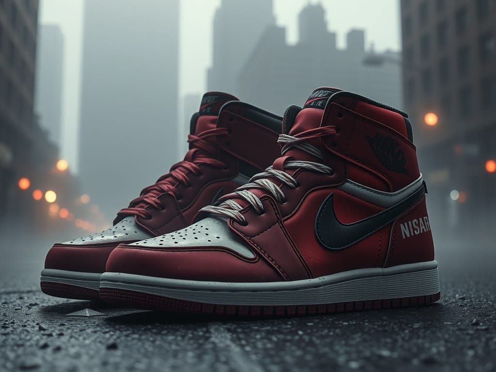 A striking picture of worn Nike Air Jordans in Chicago Bulls colors, set on a foggy Chicago street. The matte painting aesthetic features intricate details and ambient lighting.
