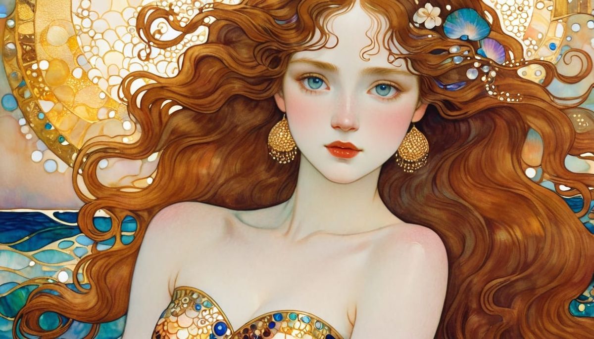 This enchanting portrait captures Aphrodite as The Little Mermaid in a vibrant, dreamy watercolor style, with shimmering scales and golden hour glow, set against a backdrop of ornate, baroque elegance.