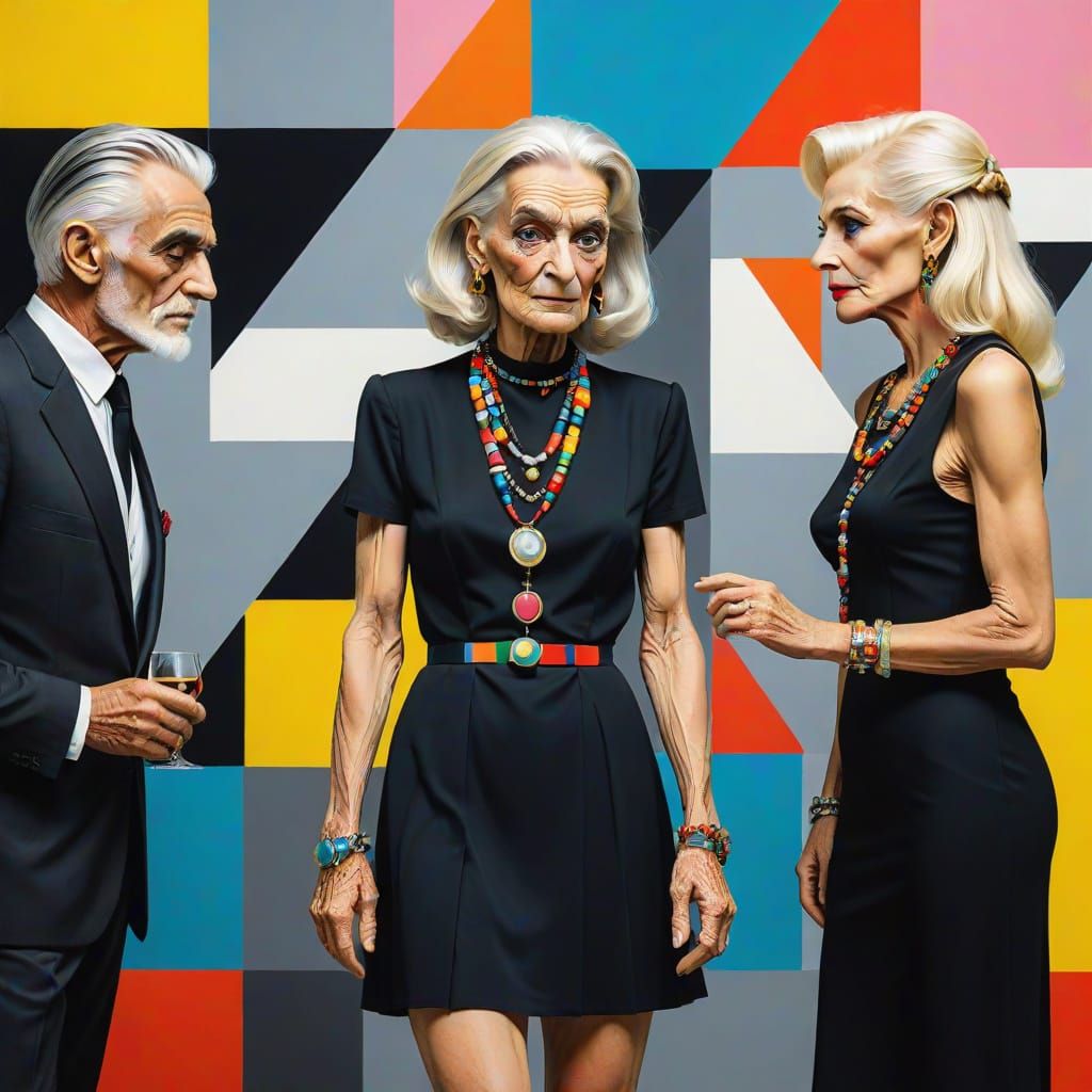 This image portrays an elderly transvestite with striking wrinkles and long blonde hair. Dressed in a short black dress, adorned with jewelry and high heels, in a pop art style.