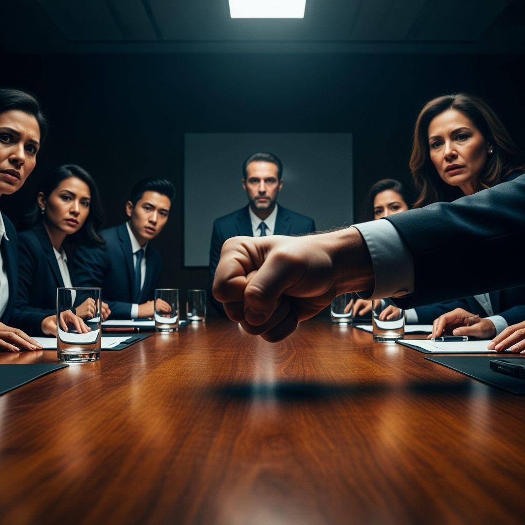 A photorealistic film still of a fist about to slam down on a table in a boardroom, with scared people looking on. The image is stylized with film grain and deep color grading.