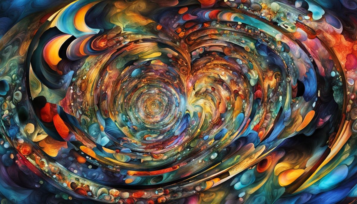 (Bosch, Miro, Kadinsky:2.0) Expressive brushstrokes creating depth and motion. kaleidoscopic, and otherworldly, glowing ...
