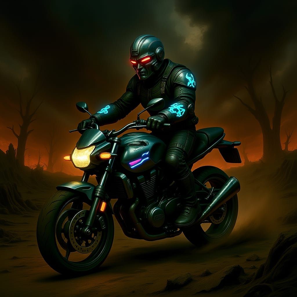 A lone biker travels through a desolate, post-apocalyptic wasteland. The rider sports glowing glyphs and a sleek chrome motorcycle. The image is rendered with cinematic lighting and a dark fantasy aesthetic.