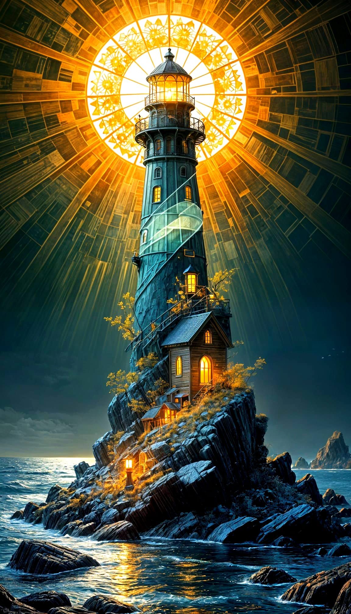 This image showcases a detailed, glowing sea glass lighthouse bathed in the warm, golden light of October. Featuring ornate sun details and dramatic lighting.