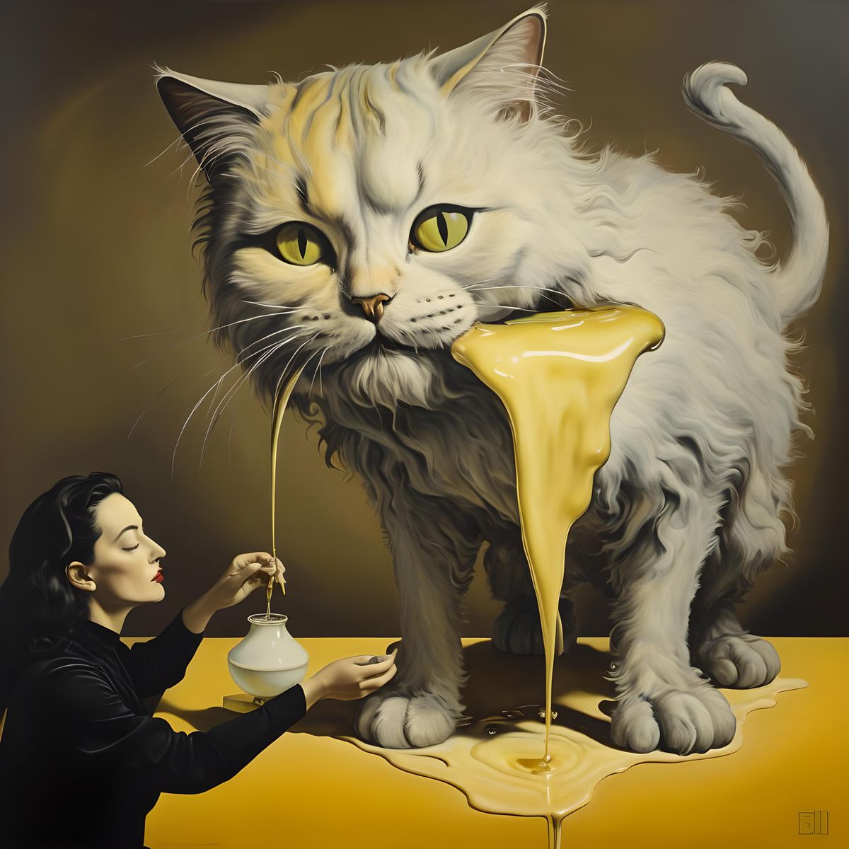 A surreal painting of a woman feeding a giant cat. The digital artwork has a matte background and a melting effect reminiscent of surrealist oil paintings.