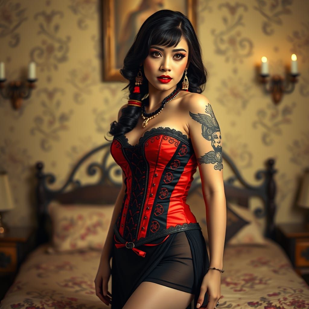 This image shows an Asian woman with cat eyes and Egyptian makeup, wearing a red and black corset and skirt. The image has a vintage cinematic aesthetic.