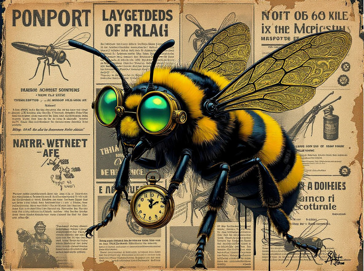 This image showcases a detailed bumblebee carrying a pocket watch and map, set against a backdrop of faded, sepia-toned vintage insect sprayer ads. The artwork has a cyberpunk aesthetic.