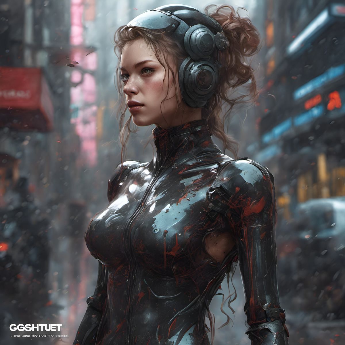 A digital painting of a girl wearing a full body latex suit. The hyperdetailed fantasy art is rendered in 4K resolution with elements of album cover art.