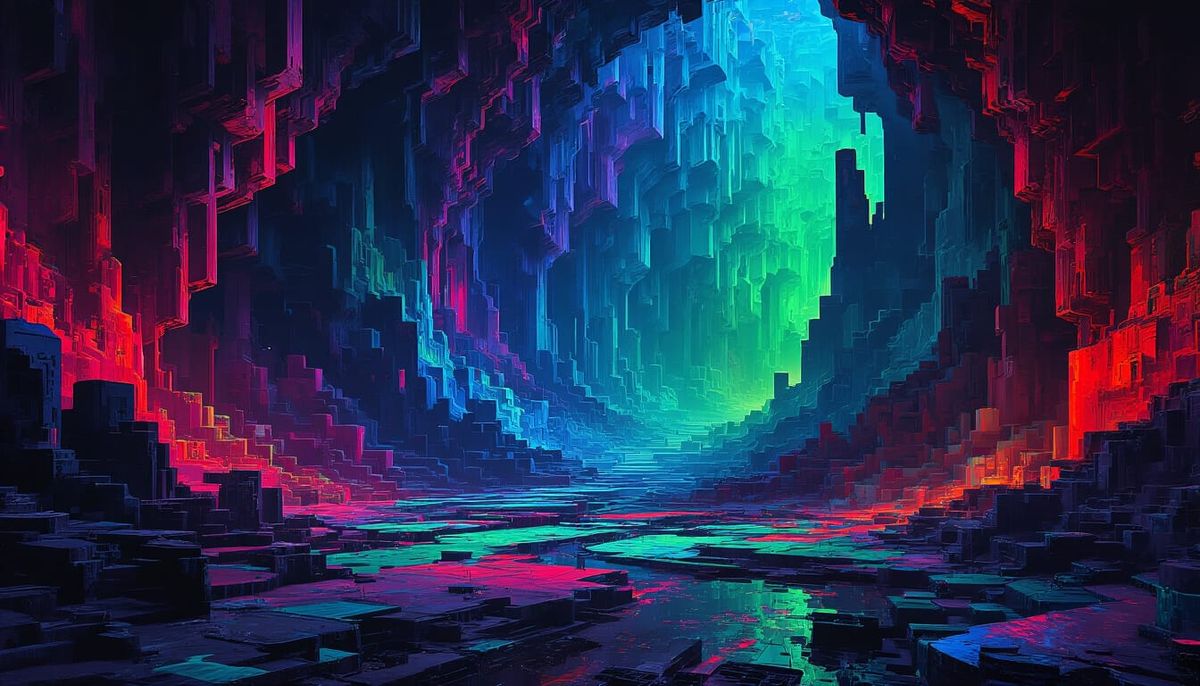 This image presents a vast, cavernous expanse with intricate cubist patterns, blending awe with horror. Abstract surrealism elements create a disorienting, captivating scene with dramatic, high-contrast lighting.