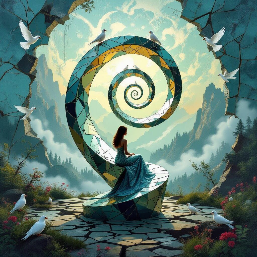 This image shows a sculptor seated in her spiral artwork. Surreal scenes with creatures from folklore are set against cracked mirrors, symbolizing strength. A serene landscape features birds in flight, abstract designs, and glowing mist.