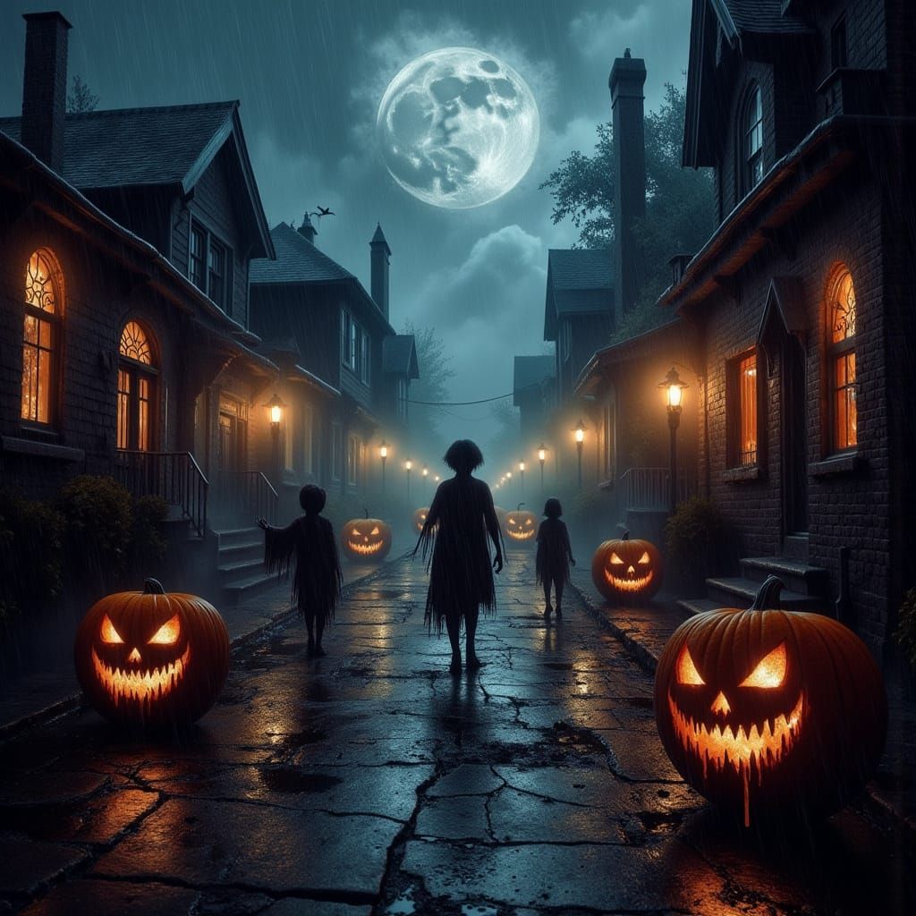 A nightmarish Trick-or-Treat scene drenched in dread and surreal horror. The neighborhood street is warped and unnatural — houses twist at impossible angles, their windows glowing with a sickly amber light that flickers like dying embers. The pavement is cracked and slick with black rain, reflecting ...