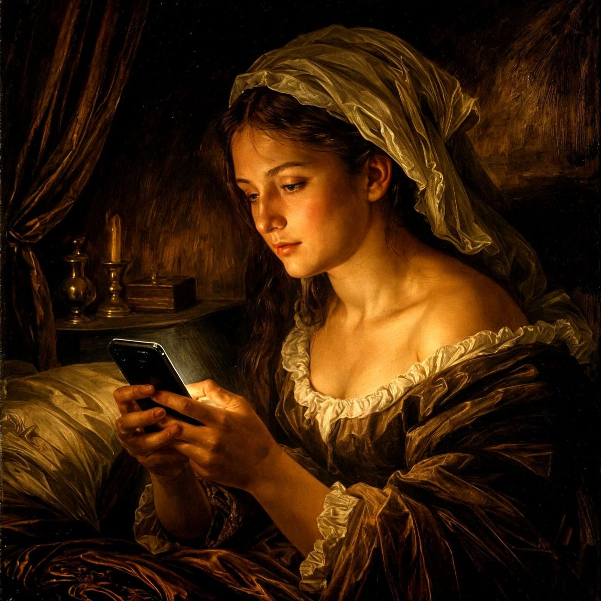 This oil painting depicts a woman in a bedroom, her face dramatically lit by a mobile phone, rendered in an old master style with chiaroscuro lighting.