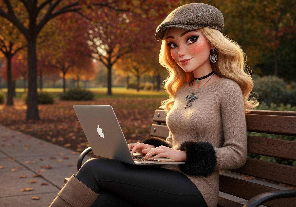 This image shows a detailed anime-style portrait of a beautiful writer in an autumn park. She is typing on a laptop and gazing at the viewer, rendered with vibrant colors and realistic skin details.