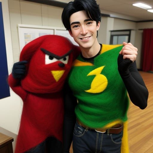 This image shows a felted figure of Tim Drake. The handcrafted appearance gives the character a charming, tactile quality.