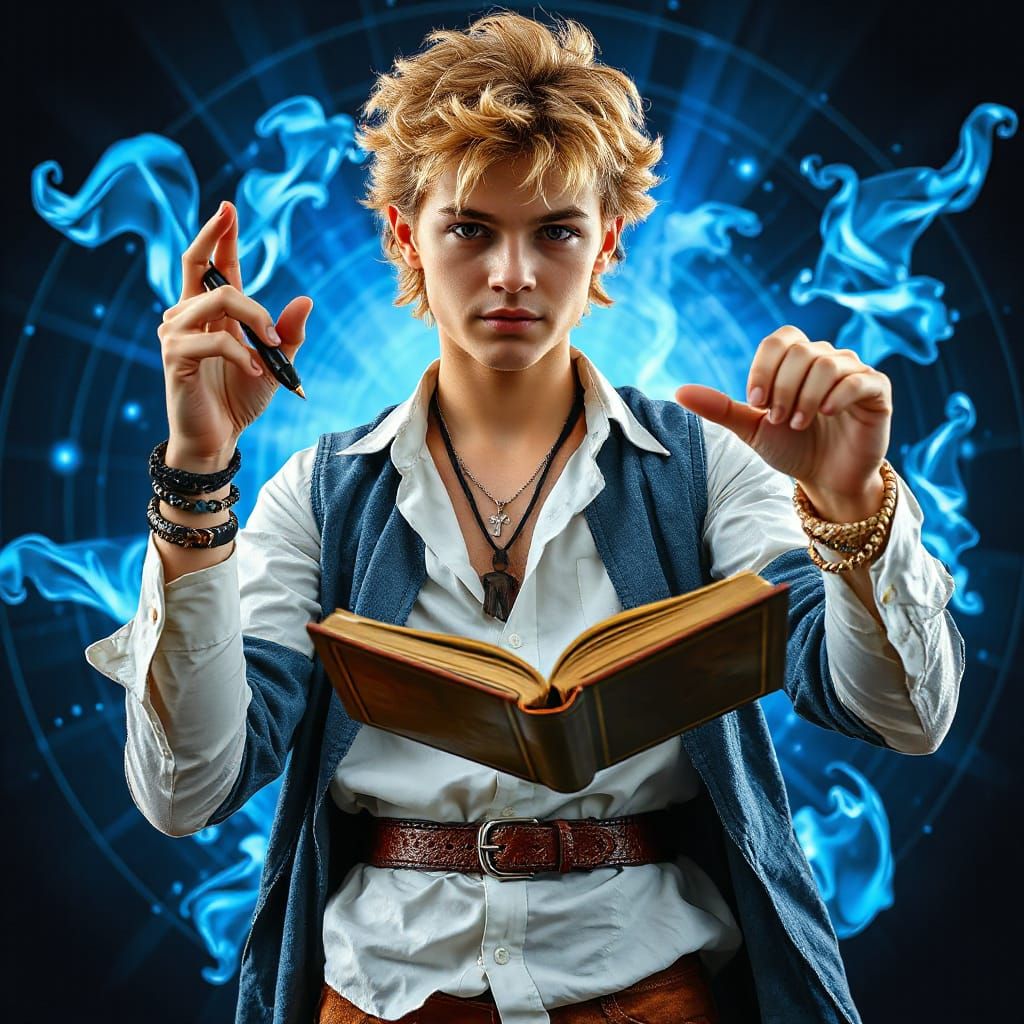 A determined young wizard with curly hair uses magic to transcribe a spell book. The scene features a mystical aura with swirling water and blue light, rendered in a highly detailed, colorful fantasy style.