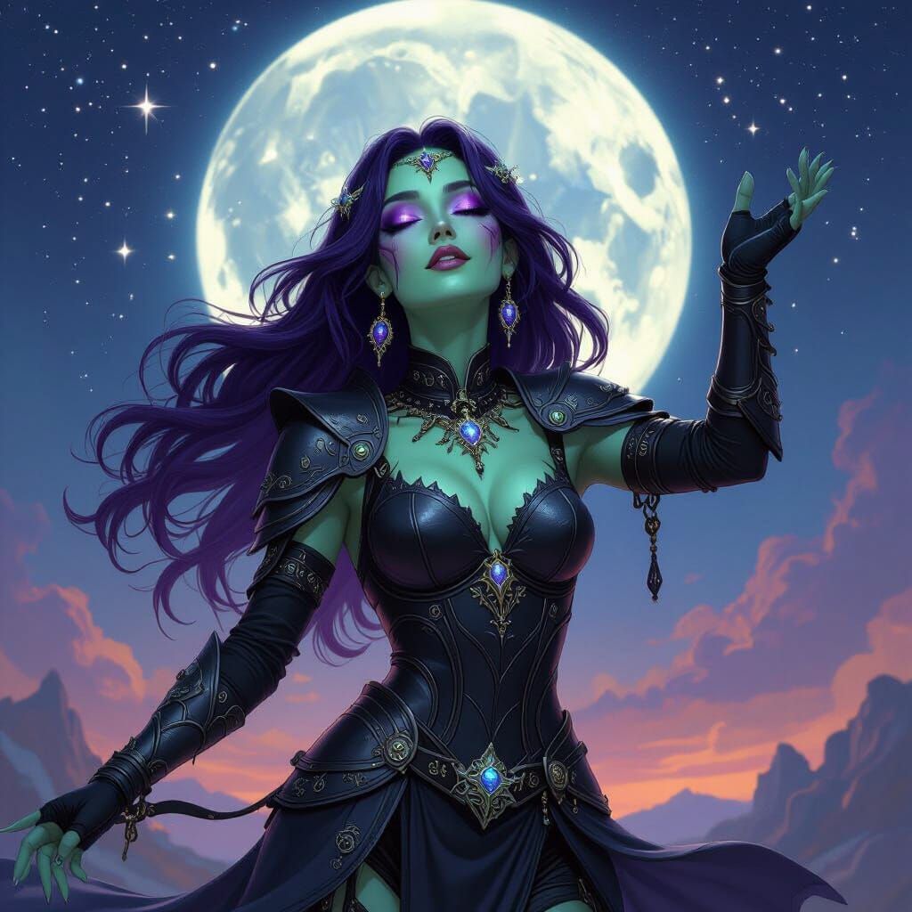A vibrant high fantasy concept art piece featuring an Aasimar bard with opalescent green skin, dancing ecstatically under a starry night. The art showcases intricate details and a magical, ethereal glow.