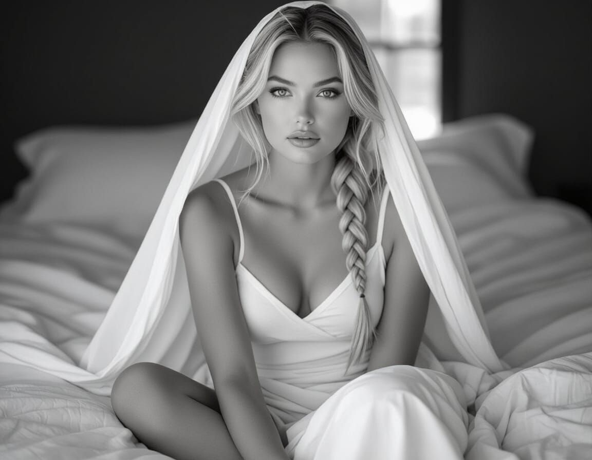 This hyperrealistic black and white photo captures a blonde actress with a braid, seated on an unmade bed. Professional lighting creates soft shadows and highlights, emphasizing exquisite detail.