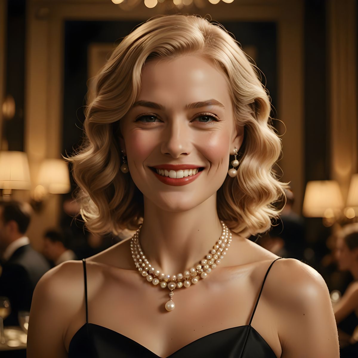 A stunning film still of a beautiful blonde woman in a formal black dress, exuding classic Hollywood glamour and sophistication with her radiant smile and elegant attire.