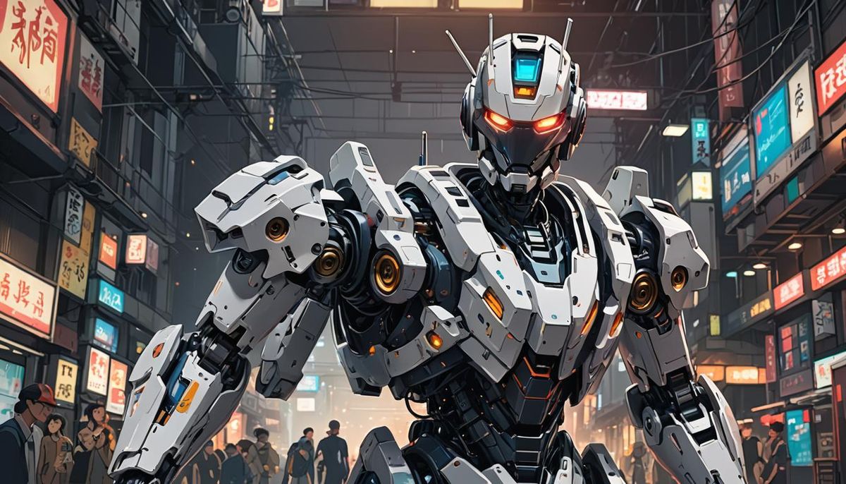 This image shows an AI robot in a cel-shaded anime style. The digital art features deep colors and cinematic lighting, reminiscent of a manga scan.
