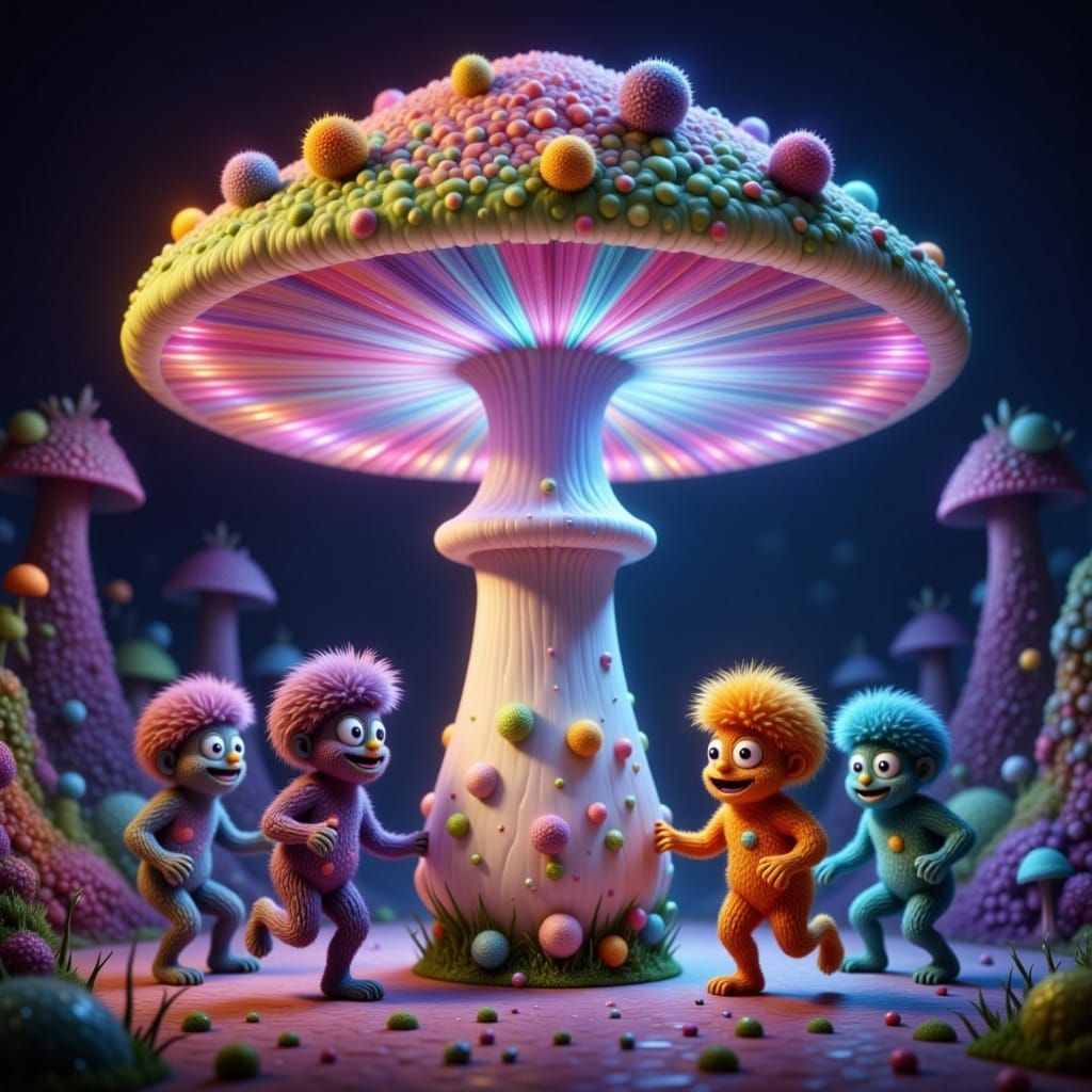 This image shows fuzzy Fraggles dancing on a giant mushroom with a neon-glowing cap. The artwork features a surreal, melting aesthetic with pulsing disco lights.