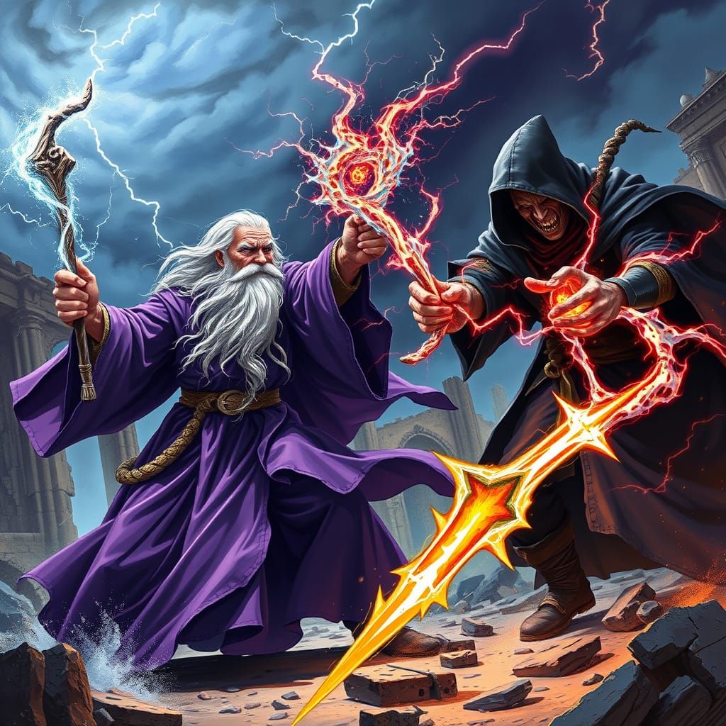 This image depicts an epic fantasy illustration of a powerful wizard and a warlock engaged in a magical duel amidst ancient ruins. The scene features vibrant colors and dramatic lighting, highlighting intense arcane and shadowy energies.