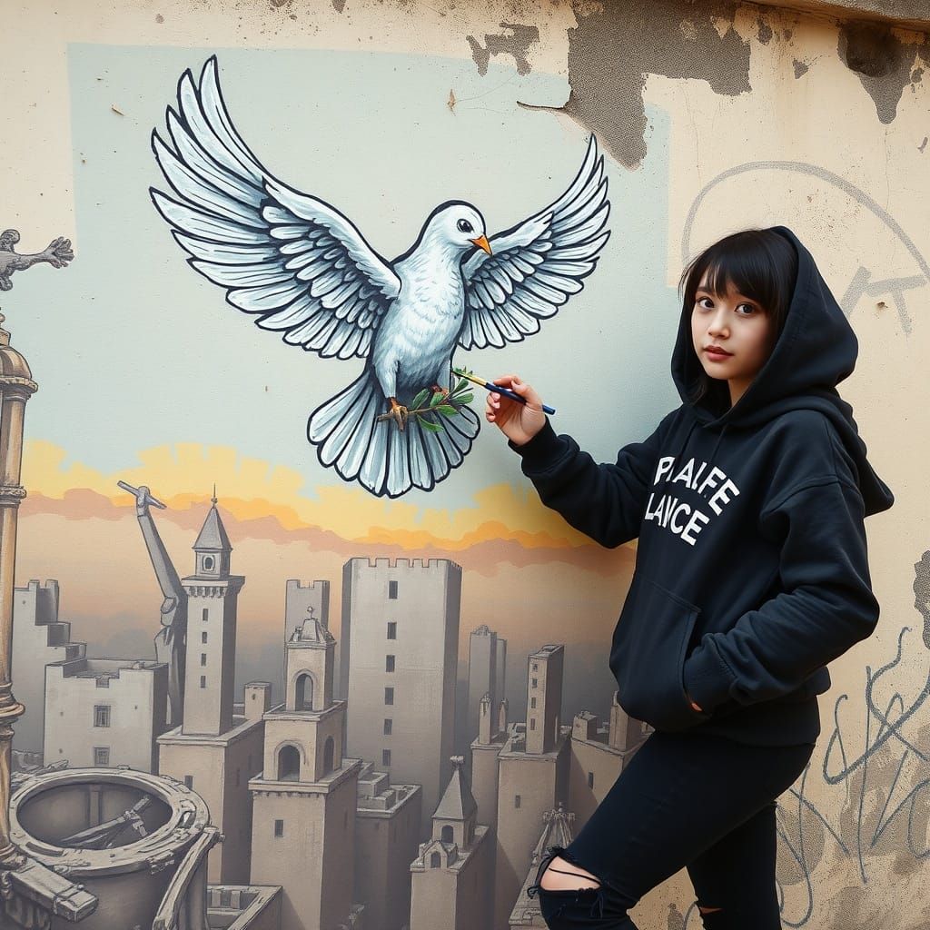 A photorealistic emo girl paints a dove of peace over a ruined city on a baroque wall. Features detailed, high-contrast graffiti art inspired by modern sci-fi aesthetics.