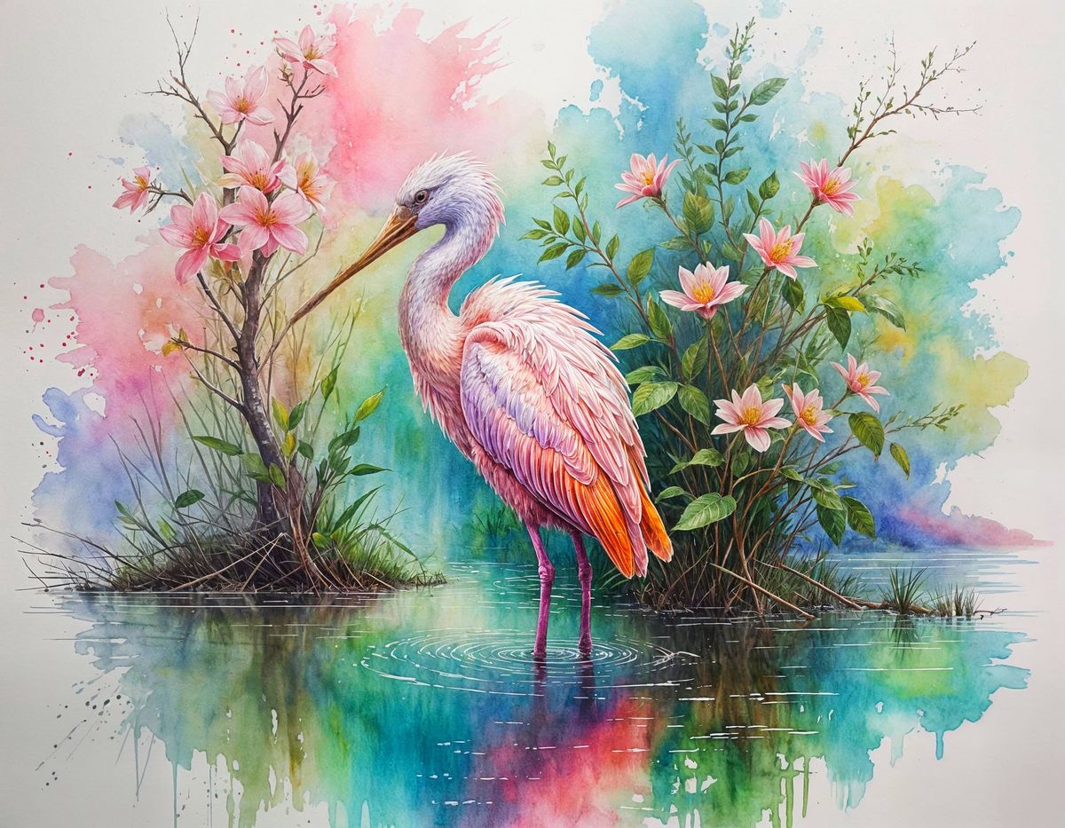 Roseate Spoonbill Wades in Mangrove Estuary Watercolour