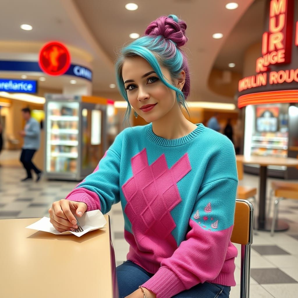 This image shows a singer in a turquoise sweater with magenta hair, adorned with a Chinese bracelet and pink boots, sitting in a vibrant food court setting. This digital art has a hyperrealistic style.