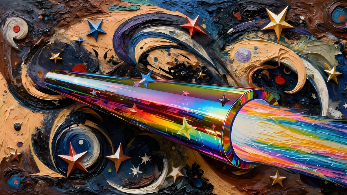 This image features a sleek, rainbow-enameled cylinder with a vibrant, iridescent exhaust trail. It mirrors a tempestuous vortex of thick, impasto oil paint and swirling 3D stars.