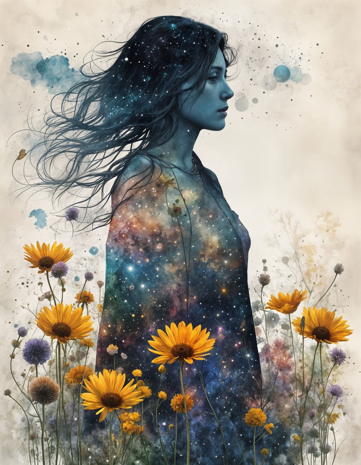 A captivating image of a woman standing in a wildflower field, her silhouette blending into a colorful nebula. The artwork is highly detailed, hyperrealistic, and maximalist, in a surreal style.