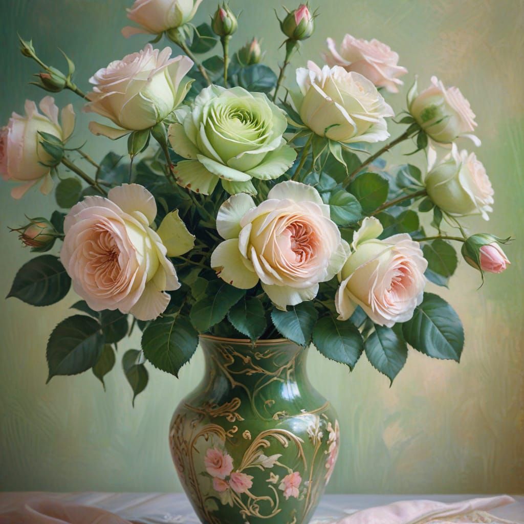 This Art Nouveau oil painting showcases a close-up of green roses with soft pink accents in a vase, featuring impressionistic brushstrokes and a delicate pastel palette.