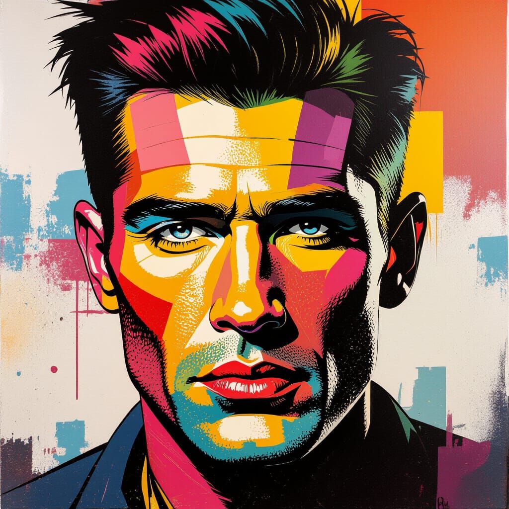 A vibrant portrait of a man's face in a pop art style. The artwork incorporates graffiti, splash art, and street art elements, with high contrast and colorful hues.