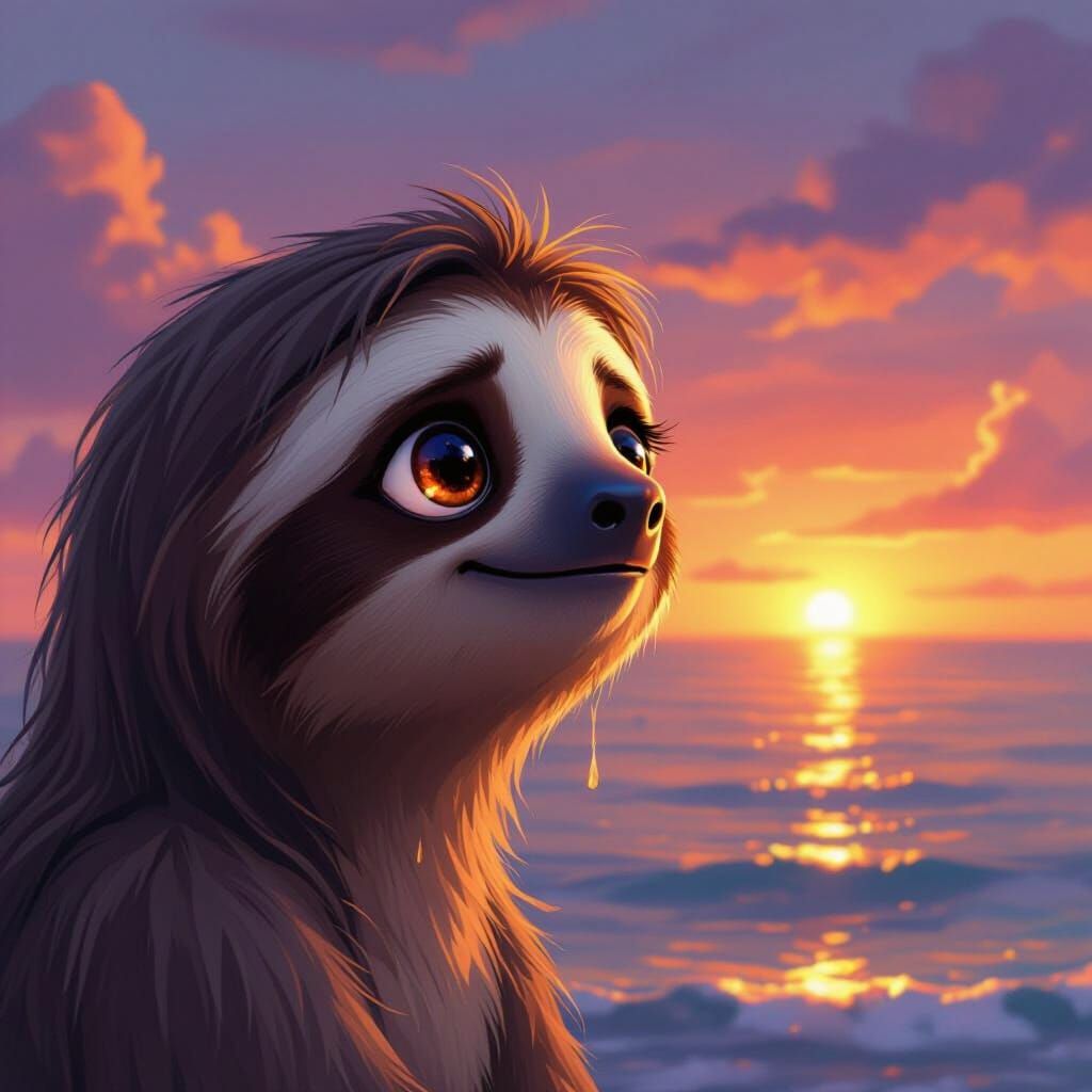 This image shows a sloth girl crying by the sea at sunset. The warm, colorful sky and gentle lighting create a melancholic mood, highlighting her deep longing.