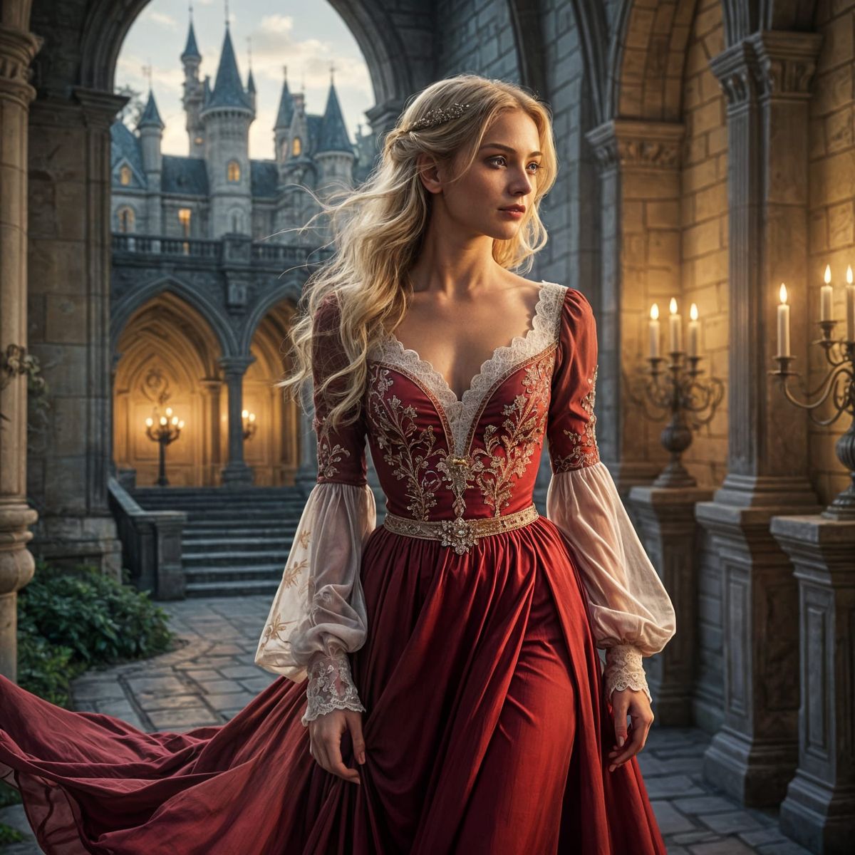 This image features a beautiful blonde woman standing in a romantic fantasy castle setting, surrounded by ornate architecture and soft lighting, showcasing her elegant attire and delicate expression.