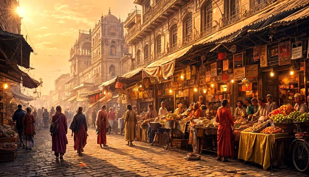 A vibrant marketplace scene in old Kanpur, India, rendered in vintage travel poster style. The image showcases intricate architecture bathed in golden sunset light, with a soft film grain and misty atmosphere.